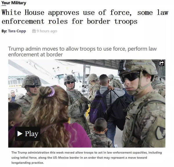 据美国《军事时报》(Military Times)报道,该命令容许军人采取他们认为所必须的防卫行动,以便保障边防部门工作人员的安全。