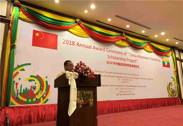 为配合“中缅友谊学校”项目的实施,在缅甸教育部的支持下,中国驻缅甸大使馆自2017年起实施了‘中缅友好奖学金’项目,该奖学金项目旨在鼓励缅甸优秀在读中小学生努力学习,资助经济困难的缅甸学生能够顺利完成学业,项目由中国大使馆委托中国扶贫基金会(CFPA)缅甸办公室具体执行。项目实施2年以来,已经累计向20所“中缅友谊学校”和缅甸各社会教育团体颁发了共计8.5亿缅币的奖助学金(约371万人民币),共有4000余名缅甸在读学生受到了资助。