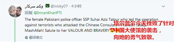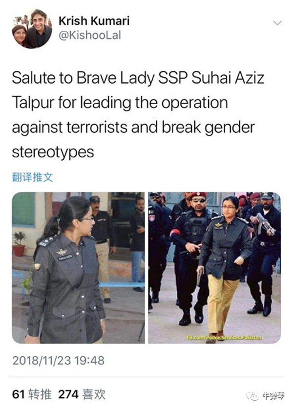 还看到一个小视频,恐怖分子被打死后,巴基斯坦官员到中国领事馆慰问,信德省首席部长穆拉德·阿里·沙当场向中国外交官夸赞说,“苏海·阿齐兹,你给大家树立了一个英勇的榜样,这就是敢为人先的女性形象。”