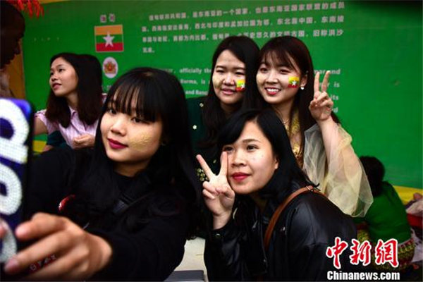 图为 缅甸留学生为中国大学生绘制菩提叶妆容并合影。 罗永皓 摄