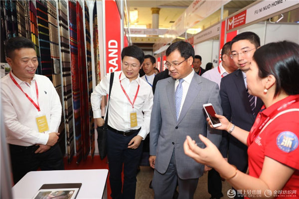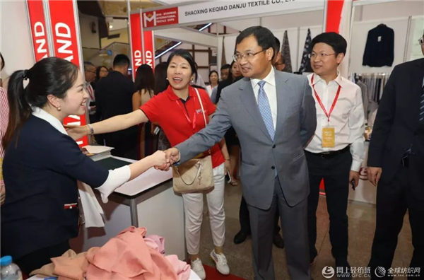 随后,浙江中国轻纺城集团股份有限公司副总经理高晓辰,全球纺织网、网上轻纺城CEO韩冲陪同商务部外贸发展局副局长韩圣健、中国纺织品进出口商会会长曹甲昌等领导嘉宾巡馆,与展商、采购商交流。