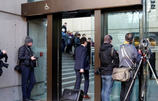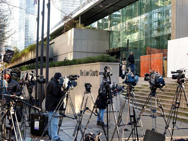 记者在不列颠哥伦比亚省最高法院外报道华为CFO孟晚舟的保释听证会。加拿大检察官在法庭上表示,孟晚舟涉嫌欺诈罪,美国司法部在今年八月向她发出逮捕令(2018年12月7日)。