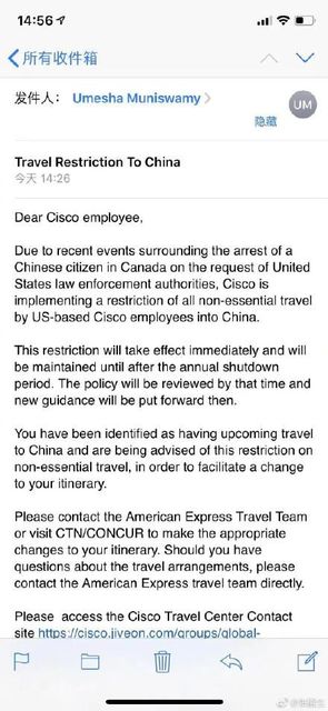 两位思科美国总部不同部门的员工对新浪科技透露,思科员工去中国大陆出差非常频繁和日常,他们都没有收到过这封邮件。其中一位员工看过截图表示,这封邮件措辞非常令人不悦,而且带有命令强制语气,根本不像出自美国总部行政部门。