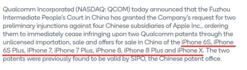 高通公司在一份声明中称,涉及禁售的苹果iPhone比例接近该公司的全部机型,包括iPhone 6S、iPhone 6S Plus、iPhone 7、iPhone 7 Plus、iPhone 8、iPhone 8 Plus和iPhone X。但不包含苹果今年推出的iPhone XS系列和iPhone XR的新款手机。