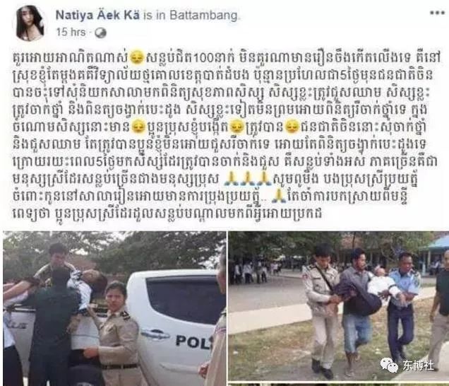12月7日下午,在柬埔寨马德望省一所中学近百名学生晕倒的事件发生后,一账号名为“Natiya Aek Ka”的网友,在Facebook上发帖称“近百名学生晕倒的原因都是因为中国人到学校去给学生体检抽血打针所导致。”