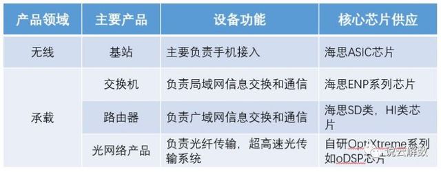 先说运营商业务,运营商业务核心就是通信网络,这块业务是直接卖通信设备和系统解决方案给全世界通信运营商,如中国移动、德国电信、沃达丰等。整个通信网络的核心设备是基站、交换机、路由器以及光网络产品,其核心技术是各产品上的处理芯片。基站这一产品,主要分为发射端和接收端,目前使用华为海思自研的ASIC芯片;交换机产品,也使用海思自研的ENP系列芯片。