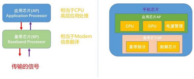 先说手机芯片,在手机芯片领域,所有智能手机芯片方案的核心都是两块:一是负责高层处理部分的应用芯片AP,另一部分基带芯片BP。AP即Application Processor(应用处理器),包括CPU(中央处理器)和GPU(图形处理器),BP即BasebandProcessor (基带处理器),相当于我们使用的Modem,负责处理各种通信协议,如GSM、3/4/5G等,打个比方,基带芯片就相当于一个语言翻译器,它负责把我们要发送的信息(比如:语音,视频),根据制定好的规则(比如:WCDMA,CDMA2000),进行格式转换,然后发送出去。