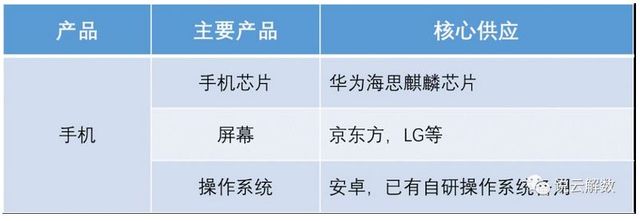 再说下消费者终端,这块业务跟普通大众接触最多,也让大部分人开始认识和了解华为。与大家接触最多的就是华为手机,当然现在还衍生出来了平板、笔记本、智能手表等终端产品,不过最大的业务还是手机,占消费者营收90%以上吧。手机产业链的核心技术和元器件分别是芯片、屏幕和操作系统。