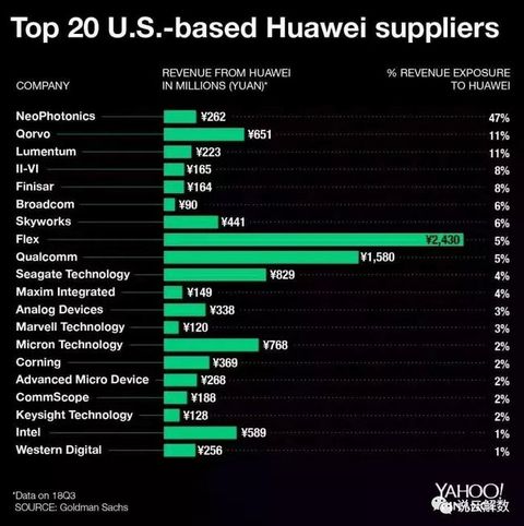 我们看下图来自雅虎财经最新的统计数据,Top20的美国供应商以及华为采购占它的营收比。2018年前三季度,华为为Top20的美国供应商采购了100多亿人民币的产品和设备(全美国供应商数据肯定还要大),其中Flex、高通、英特尔采购额度很大,像新飞通光电(NeoPhotonics)、Qorvo等,华为成了主要业务伙伴。当然这里不是全年的数据,如果是全年数据,数据会更大。如果华为被封杀,美国产业链影响也不小,美国国内很多公司估计也会跳起来,比如高通、新飞通等公司。