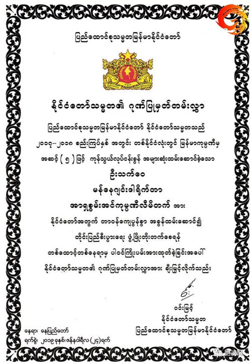 2019年1月24日,缅甸政府在内比都的总统府向2017-2018纳税年度最高纳税人颁发荣誉奖项和证书。