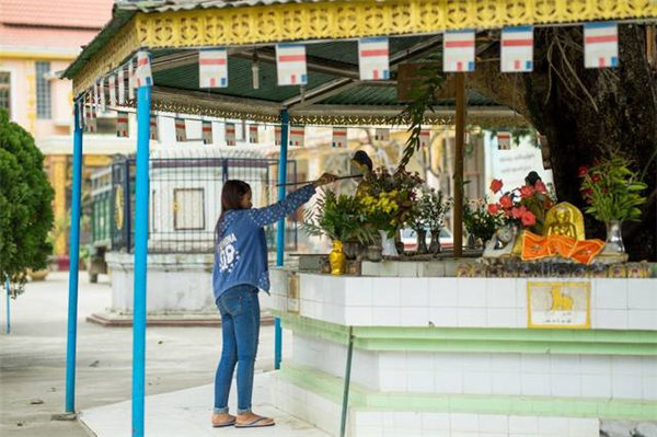 因为供奉的是鲜花,所以给鲜花浇水也就成了礼佛的一种方式。图中,一位缅甸少女正在给佛像前的鲜花浇水。有些佛像前面还专门会放一些水和一个浇水的瓢,就是供一些信众来浇水礼佛使用。