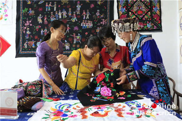 彝族刺绣非遗传承人游定美(右一)现场教授缅甸友人刺绣技法。