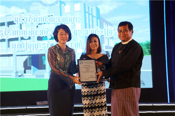 梅茵吞代表缅甸关爱被遗弃儿童协会接受捐款并感谢中国为缅甸关爱和照顾被遗弃儿童提供帮助,感谢中国始终致力于改善和提高缅甸人民的生活水平,为缅甸人民谋福祉。