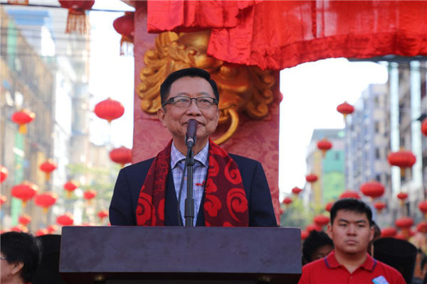 仪式结束后,洪亮大使夫妇、吴漂民登夫妇等全体嘉宾沿唐人街步行,向现场民众拜年,致以新春祝福。