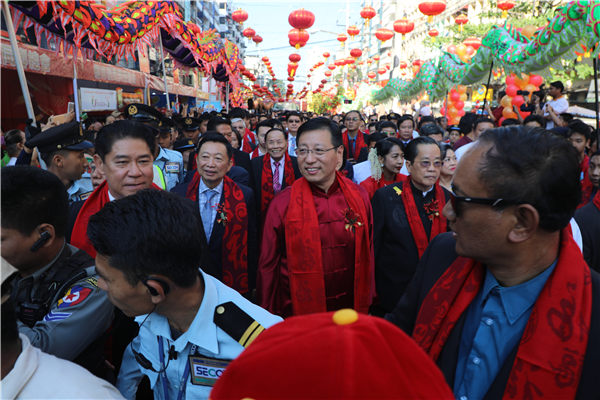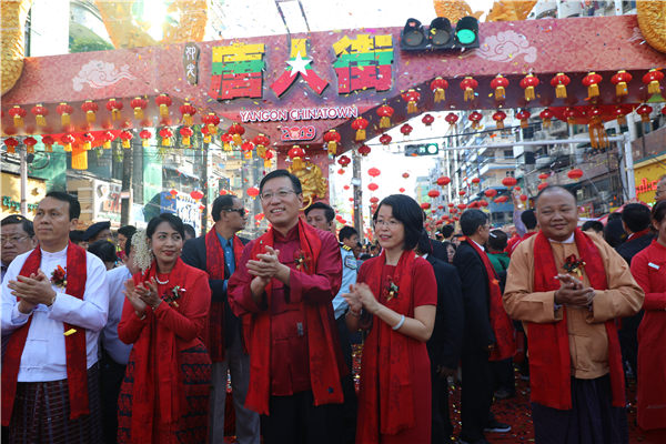 2月5日上午,中国驻缅甸大使洪亮偕夫人王雪鸿女士应邀出席2019年仰光唐人街新春庆典开幕仪式。仰光省省长吴漂民登夫妇、缅中友好协会主席吴盛温昂、仰光省议会副议长吴林奈敏、庆典筹委会主席、广东工商总会会长徐丛苍,仰光各华人社团、社会各界群众等数万人出席仪式。