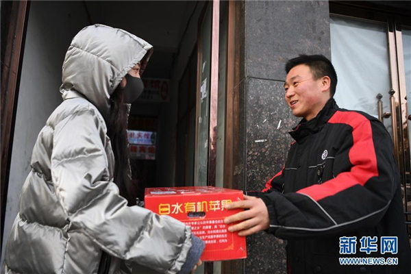2月3日,负责西安城北一个人员密集小区派送工作的快递小哥罗飞龙(右)将快递送至客户手中。 新华社记者 张博文 摄