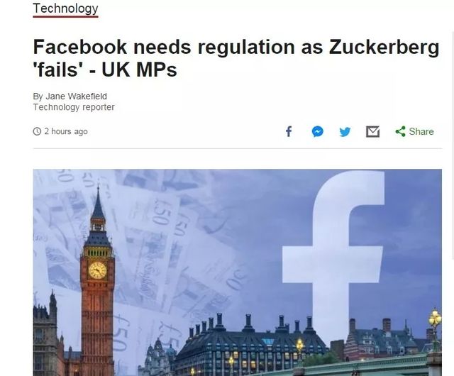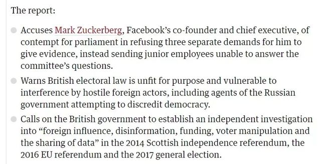 当然,根据英国《卫报》的整理,英国政府对于Facebook最主要的指控还是集中在散布假新闻这个方面,称这些Facebook上的假新闻和假消息正在威胁英国的民主,并认为英国应该及时修改其选举法,以应对俄罗斯政府等外国敌对势力通过Facebook这样的平台干涉英国的选举。