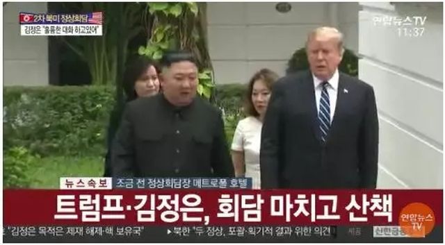 据韩联社报道,特朗普当地时间上午8时40分许首先到达酒店,大约5分钟后的8时45分许,金正恩也抵达酒店。9时许,两人举行单独会谈,结束后还在会场外散步,9时45分起举行扩大会谈,并共进午餐。