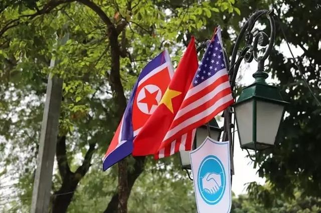 朝美领导人到来前,越南首都河内街道上布置的朝鲜、美国及越南国旗。