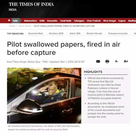 印媒:印飞行员被俘前曾吞秘密文件,朝天开枪