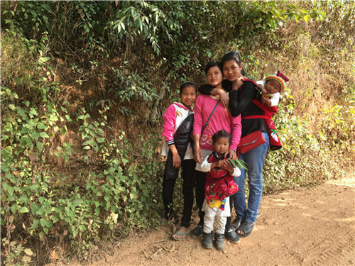 她们都是从缅甸过来的,最左边的女孩叫李现,今年8岁。她的母亲过世了,来投靠嫁到冷水沟的小姨。平时帮着小姨照顾孩子。辍学。中间的两个女孩都还不到20岁,是嫁到村里的缅甸崩龙族姑娘。另外两个小女孩是在村里出生的孩子。这天她们相约一起去新寨子吃喜酒。