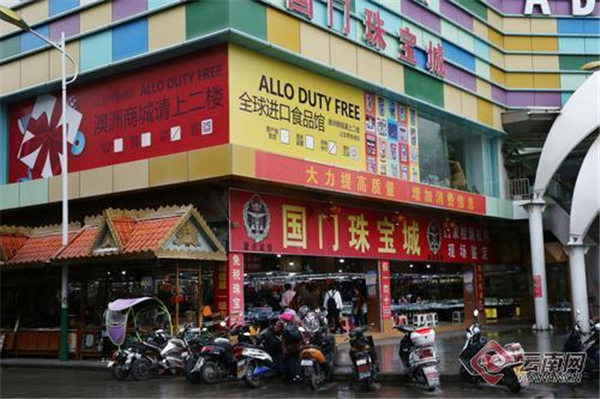国门广场周边商铺林立,有玉石翡翠交易区、银饰品交易区、缅甸特产交易区、全球进口食品馆、免税店等等,不远处还有珠宝玉石早市,更是人声鼎沸,各种肤色的人在此交易,交易区商场柜台内灯光通明,国内外商品琳琅满目,完全是一个国际市场,每天有成千上万的客商和游客在此交易和选购,寻找发财商机。
