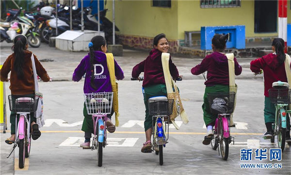 银井小学几位缅籍学生骑车回家,跨过银井边防口岸国境线(3月8日摄)。新华社记者 李晓果 摄