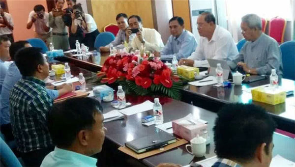 缅甸掸邦勐拉,缅甸政府和平委员会成员(桌子右边)会见果敢同盟军、德昂民族解放军和若开军成员资料图
