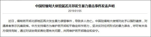 据中国驻缅甸大使馆网站1月5日消息,近日,缅甸若开邦北部地区再次发生暴力袭警事件,导致多人伤亡。中国驻缅甸大使馆对此予以强烈谴责,对遇难者表示沉痛哀悼。中方支持缅方为维护若开邦和平稳定所作努力,坚决反对任何形式的暴力袭击,呼吁有关各方保持克制,通过对话协商妥善处理有关问题,共同维护若开邦稳定和安宁。