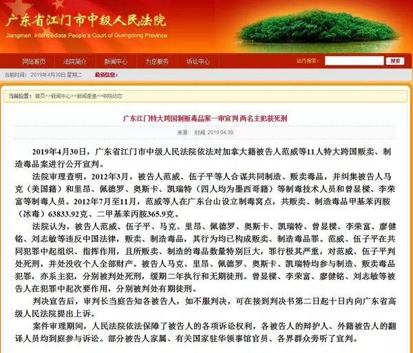 2019年4月30日,广东省江门市中级人民法院依法对加拿大籍被告人范威等11人特大跨国贩卖、制造毒品案进行公开宣判。