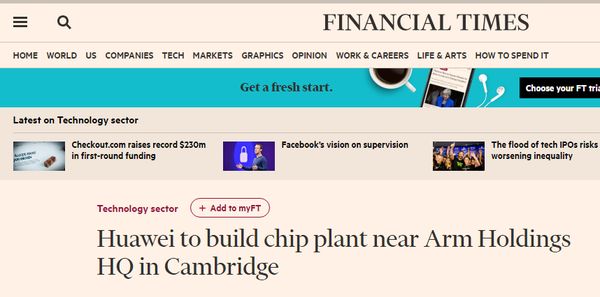 北京时间5月4日早间消息,据英国媒体报道,华为公司计划在剑桥城外建设一家可容纳400名员工的芯片研发工厂,它将位于英国芯片业的中心地带,距离ARM控股公司总部仅15分钟车程。