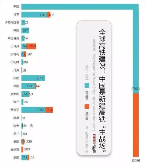 国际铁路联盟(UIC)的数据显示,截至去年10月1日,中国高铁不管是运营中还是建设中的里程,均遥遥领先全球其他国家和地区——差距有多悬殊?看看下面这张图: