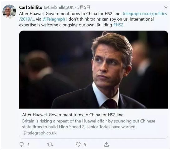 英国铁路承包商香农铁路服务公司(Shannon Rail Services)总经理卡尔•希利托(Carl Shillito)则在推特上借“华为被打压”一事嘲讽道,“我不觉得火车能够‘监听’我们。欢迎国际专家加入我们的行列,建设英国高铁二号线。”