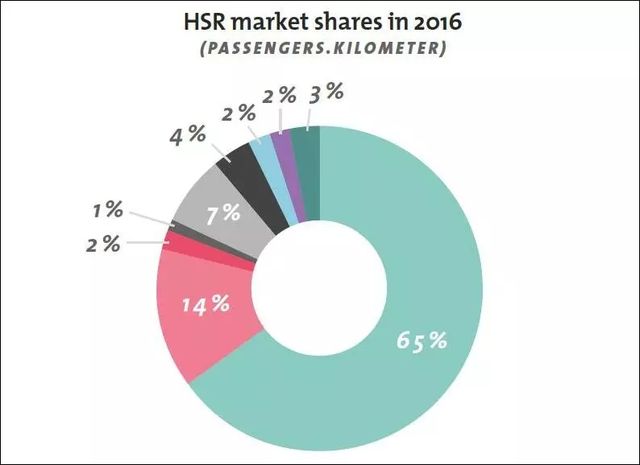 根据目前可获得的信息,在按客流量和里程计算的全球高铁市场,中国大陆占了65%的份额,排第二的日本仅占14%,而这还仅仅是2016年的数据。