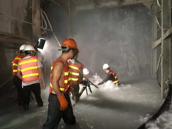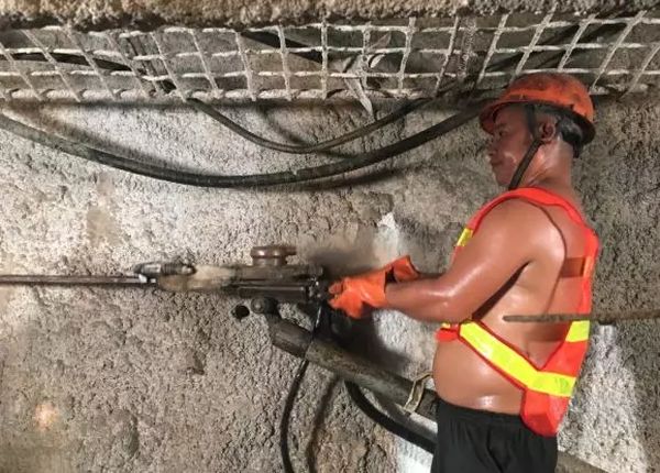大柱山隧道开工以来,隧道已经涌水约2亿立方米,相当于15座西湖。隧道进口施工人员常年带水作业,即使穿戴雨衣都会湿透。中铁一局建设者不但要经常在“水帘洞”中“淋浴”,还会经历“桑拿”。在隧道的出口,洞内施工长期处于40℃左右和85%以上湿度的恶劣施工环境,为了确保施工作业人员身心健康,项目部通过长年给隧道施工最前方的掌子面运送冰块降温。