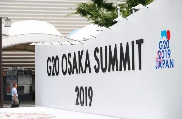 ▲G20大阪峰会新闻中心入口处的标志(新华社)