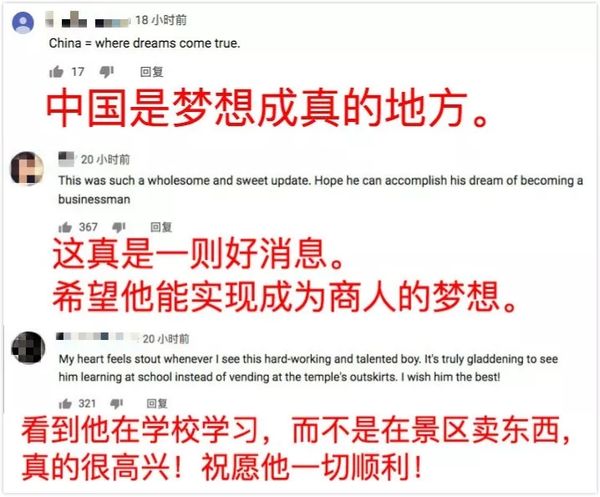 “看到他在学校学习,而不是在景区卖东西,真的很高兴!祝愿他一切顺利!”