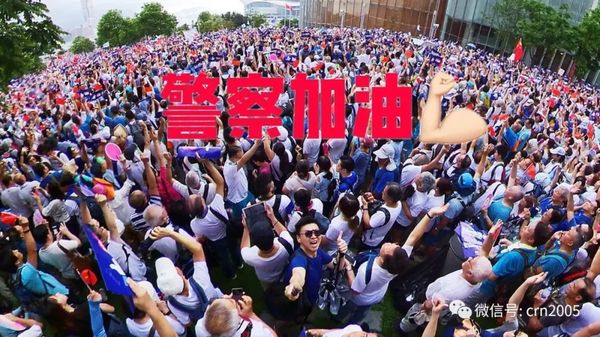 由立法会议员何君尧和香港政研会主办的“撑警察、保法治、护安宁”撑警集会于30日下午在香港金钟添马公园举行。大会宣布共有约16.5万人出席。警方则表示,最高峰有5万3千人参加。另据央视新闻联播报道,在网络上举办的“支持香港警察”等活动网上点赞人数也已超过100万。