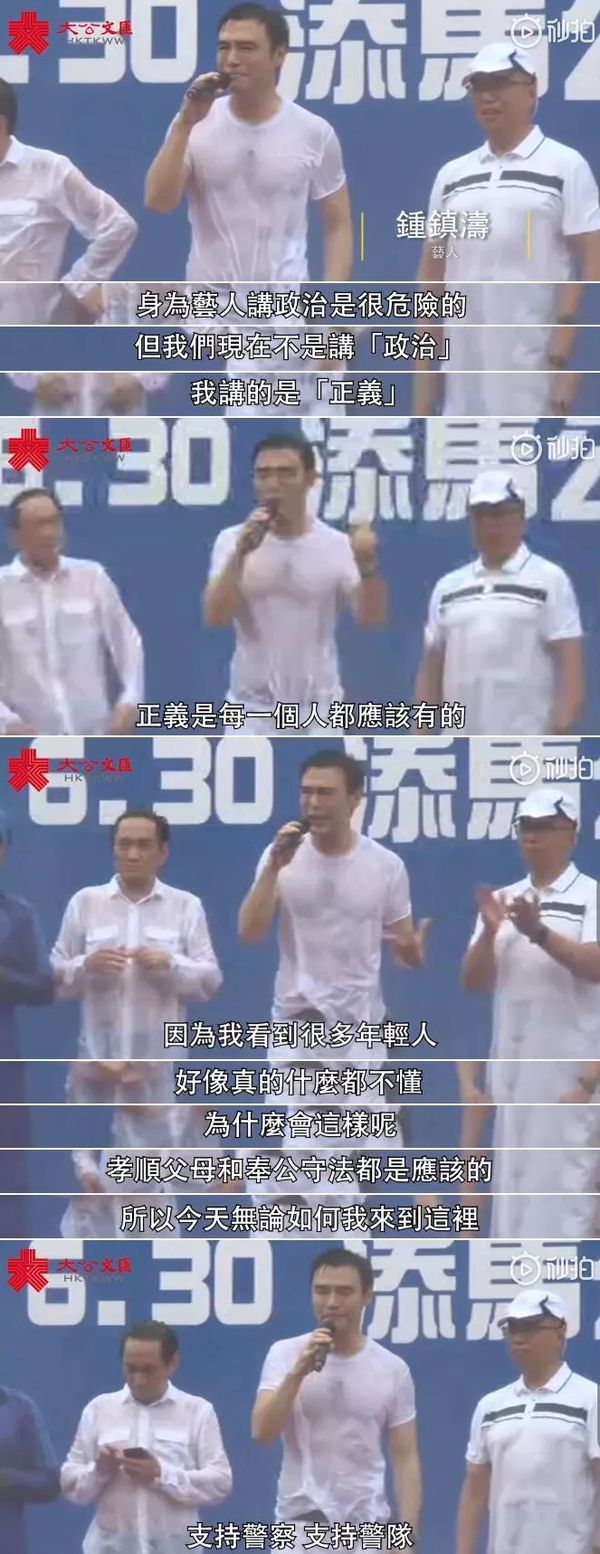 钟镇涛说,艺人讲政治是很危险,但今天不讲“政治”,只讲“正义”,正义是每个人都应该有的,现在很多年轻人好像什么都不懂,为什么会这样呢?
