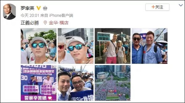 30日晚,身在横店的罗家英也在微博上发布数张集会照片,并配文:“正义必胜。”