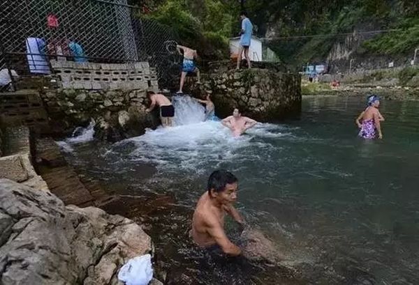 寻求“养生”者在广西巴马百魔洞出水口浸泡身体