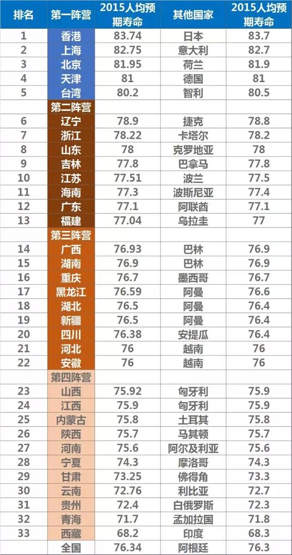 整体来看,生活在东部和南部沿海省份的人可能会活得更久。位居第一第二阵营的省市和地区,除了吉林外全都是沿海城市。香港人均预期寿命已经超越长寿之国日本,成为全球第一。同时北京、上海、天津、台湾也步入“80后”时代。