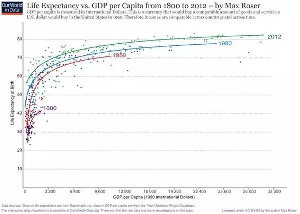 随着各国人均GDP的增长,各个国家的人均预期寿命也在增加