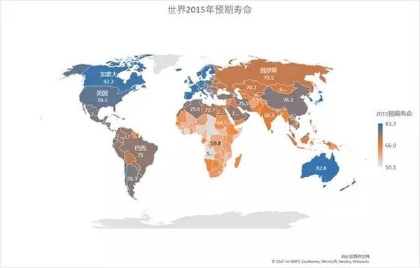 如图,颜色越深的地方人均预期寿命越长,而这些地方,恰恰也是经济强国。颜色最浅的,毫无悬念地落在了非洲地区。