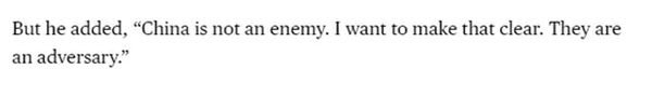 米利:“在我看来,用军事语言来说,敌人意味着你与对手进入了武装冲突,在打仗。我们没到那个阶段。我们也不希望到那个阶段。我们要的是跟中国的和平,不是战争。达到这一目的的最佳途径是我们做好准备,因为中国正在空天等多个领域非常、非常迅速地提升它的军力。这是事实,不是炒作。”