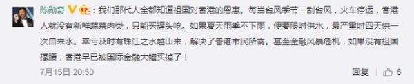 此外,陈勋奇还说,我们那代人全都知道祖国对香港的恩惠。
