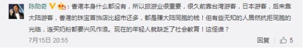在回复网友提问时,陈勋奇还提醒说,香港本身什么都没有,所以旅游业很重要,很久以前靠台湾游客,日本游客,后来靠大陆游客。而面对部分香港年轻人“抗拒同胞的光临”“连(同胞)买奶粉都要兴风作浪”的出格行为,他批评道:“现在的年轻人就缺乏了社会教育!”