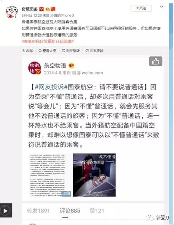 有些人在网上讲了他们的故事,在乘坐国泰航班时,说英语的和说粤语的是座上宾,但只要是说了普通话,就往往只能得到赤裸裸的低质服务。