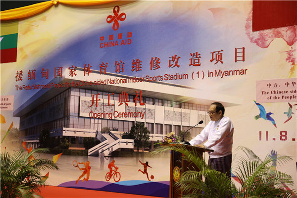 8月11日上午,中国援缅甸国家体育馆维修改造项目开工仪式在仰光举行。中国驻缅甸大使陈海、缅甸卫生体育部部长敏推、仰光省首席部长漂民登、仰光省议长丁貌吞、驻缅使馆经济商务参赞谢国祥等出席活动并为开工仪式剪彩。