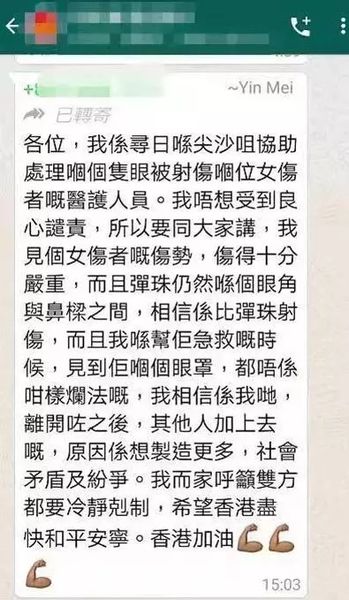 该医护人员表示:“我不想受到良心谴责,所以要跟大家讲,我看到那个女伤者的伤势,伤得非常严重,而且弹珠仍然在她的眼角和鼻梁之间,相信是被弹珠射伤,而且我在帮她急救的时候,看到她的眼罩,也不是这样的烂法,我相信是我们离开了之后,别人加上去的,原因是想制造更多社会矛盾与纷争。我现在呼吁双方都要冷静克制,希望香港尽快和平安宁。香港加油!”